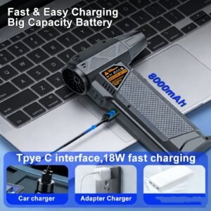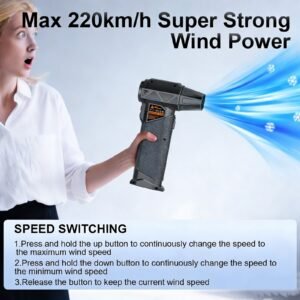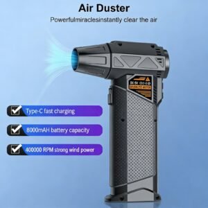 Motor sin escobillas de 400.000 RPM para una potencia de viento extremadamente alta, capaz de soplar polvo, nieve y residuos en segundos con una eficiencia incomparable. Vida útil prolongada del motor, bajo consumo energético y funcionamiento con ruido mínimo, ideal para uso prolongado. Diseño compacto y ligero que se guarda fácilmente en el bolsillo o bolso, con textura antideslizante para un agarre seguro incluso con manos húmedas. Carga rápida Type-C y batería de 8000 mAh que ofrece una autonomía prolongada y recarga en poco tiempo. Función de soplado y succión 2 en 1 para limpieza más completa, ideal para teclados, interiores de coches y componentes de ordenadores. Velocidad de viento ajustable de forma infinita para adaptarse a diferentes necesidades, desde un soplo suave hasta una potencia máxima de 220 km/h. Resistente y duradero, fabricado con materiales de alta calidad que soportan un uso intensivo. Versátil para múltiples usos: limpieza de polvo, eliminación de nieve, encendido de fuegos en campamentos, secado de pelo o superficies mojadas.