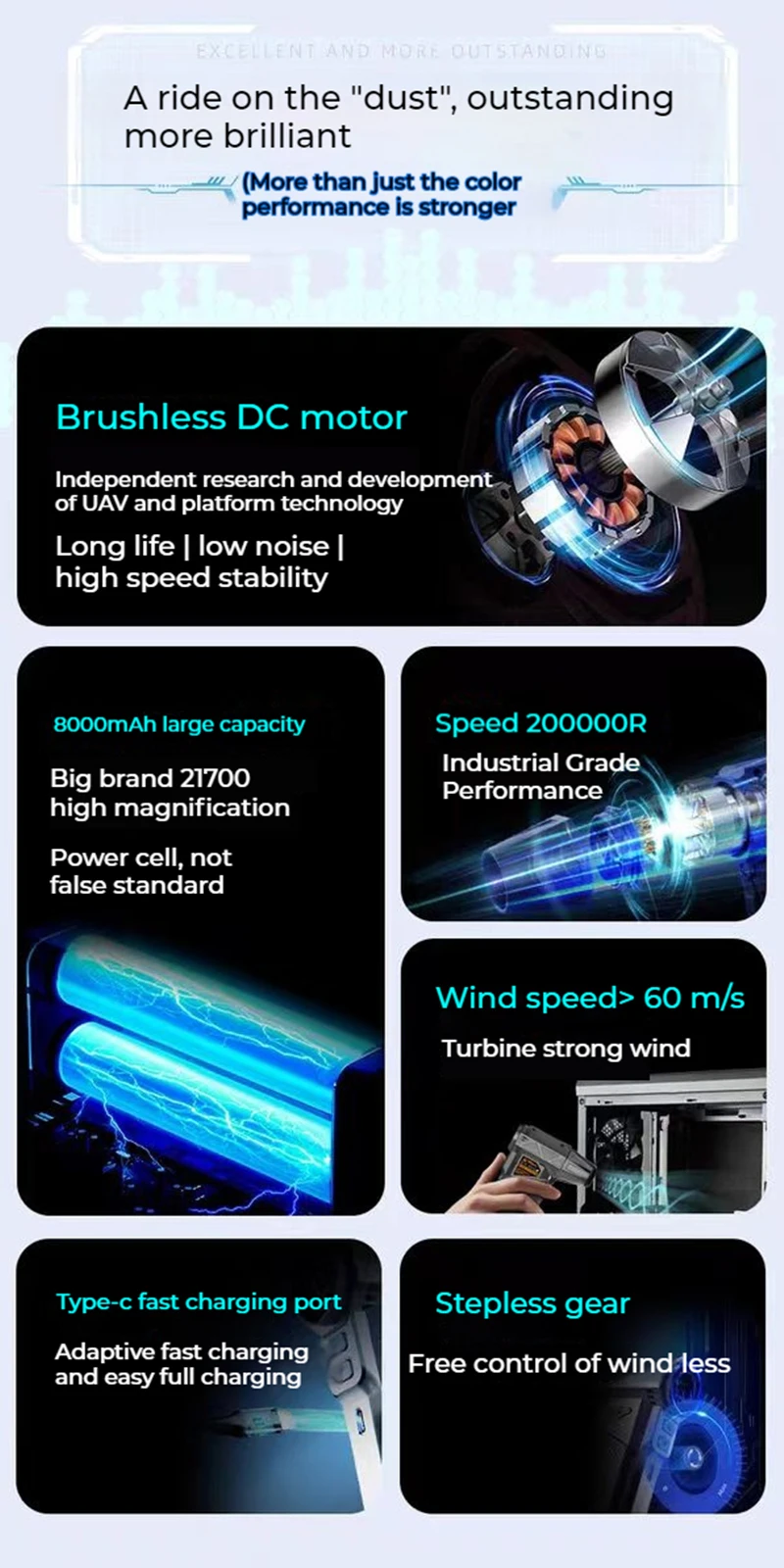 130000 RPM de potencia son la clave, sopla polvo, residuos y humedad sin esfuerzo, mucho m¨¢s potente que otros modelos del mercado.